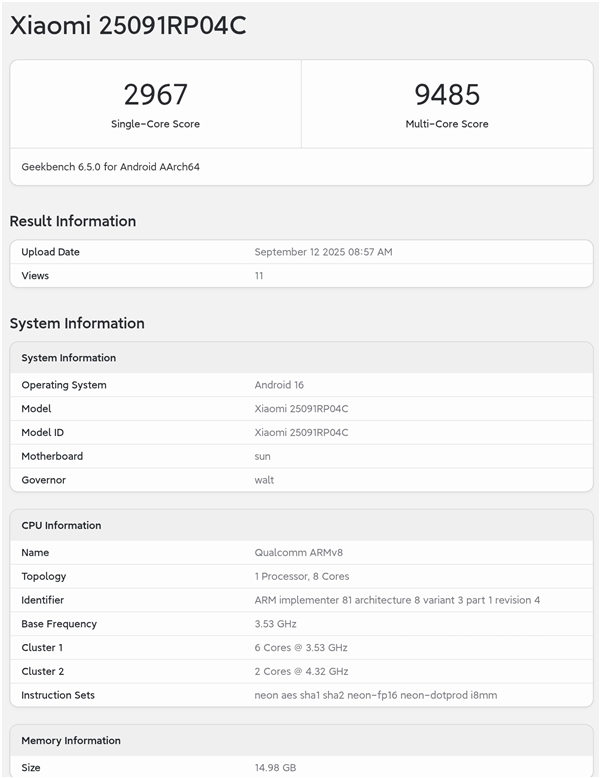 此前的跑分已经确认,小米平板8 Pro会搭载骁龙8 Elite处理器,而且是4.32GHz的满血版,配备16GB内存。