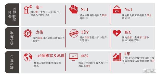 从其市场地位看,根据灼识咨询报告,按销量计,2024年,其多关节机器人在中国本土制造商中排名第三,在全球制造商中排名第七,同时公司在国内柔性协作机器人及轻负载工业机器人销量排名第一。更引人注目的是其增长速度强劲:自2023年起,公司在销量增长率方面连续两年位居中国主要多关节机器人制造商之首。