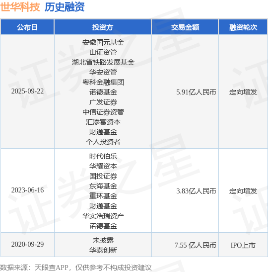 【投融资动态】世华科技定向增发融资额591亿人民币投资方为安徽国元基金、山证资管等